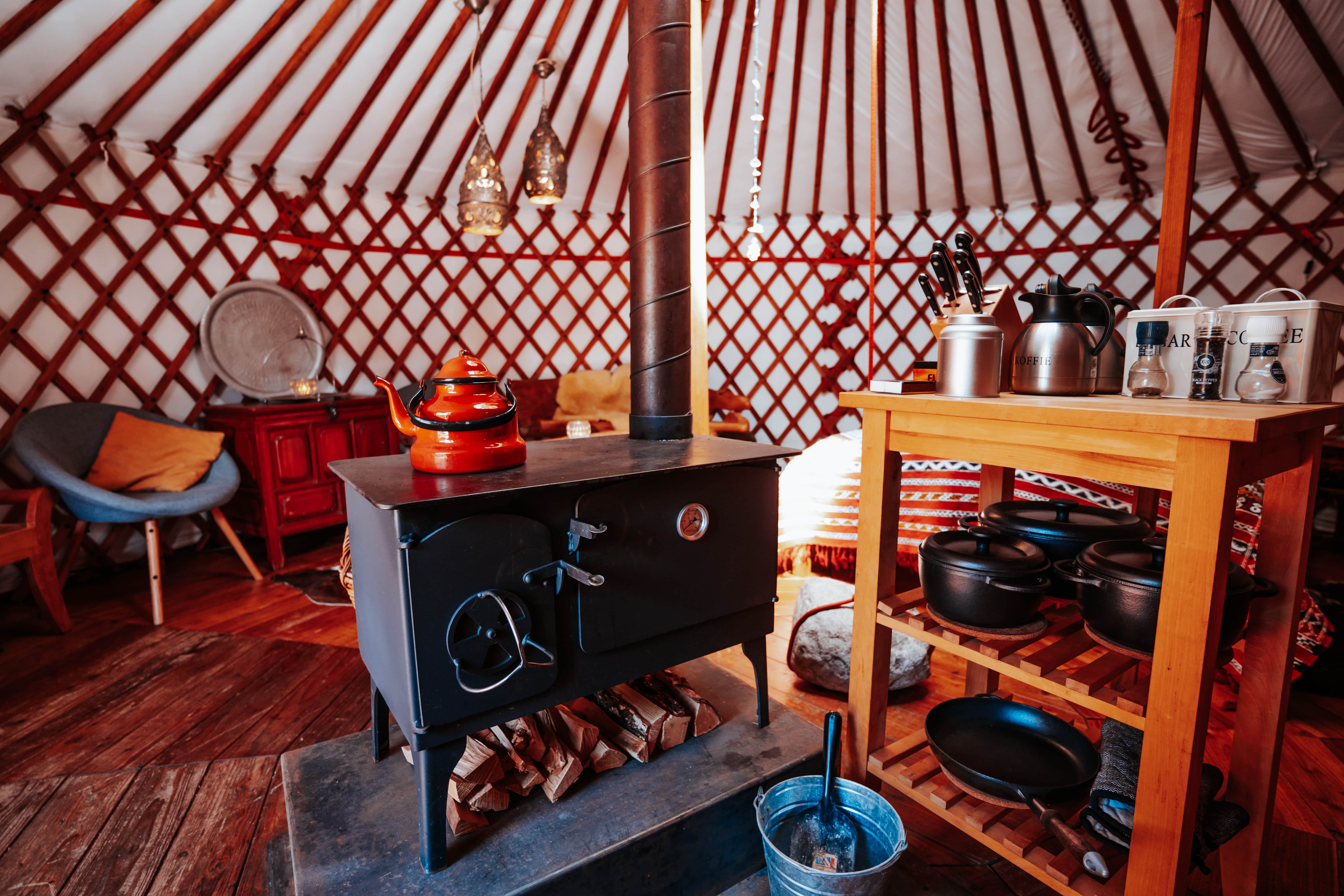 Our enchanting tents are very attractive and fully furnished with wooden floor, wood stove, extensive kitchen inventory, sitting and dining area, and of course a nice bed. Electricity and water is also there. Hammock, picnic table and outdoor chairs for lazing around complete these hideaways.